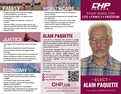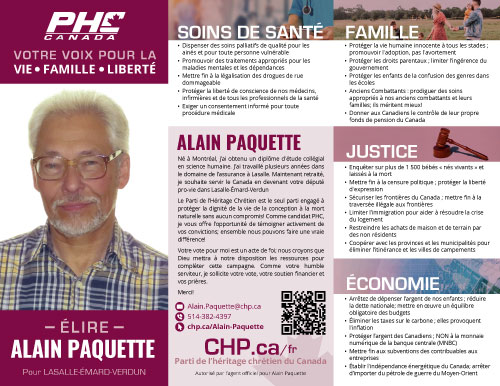 Le Parti de l’Héritage Chrétien est le seul parti engagé à protéger la dignité de la vie de la conception à la mort naturelle sans aucun compromis! Comme candidat PHC, je vous offre l’opportunité de témoigner activement de vos convictions; ensemble nous pouvons faire une vraie différence!